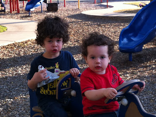 Tahl took a long nap, and then we went to pick up Zev. When we came home to play Zev was turning Tahl on the sit and spin.